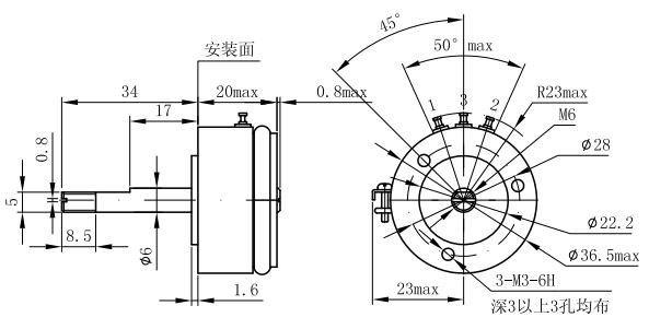 | 1; 2; 3; 5KΩ | ≤1%~0.1% | 360° | 180° 345° | 50x106 |