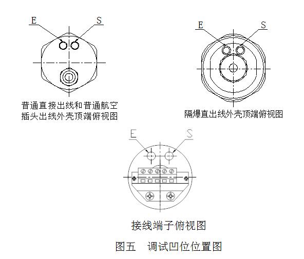 ①传感器外壳顶端上有两个调节凹位(功能设置S和确认设置E),如图五所示。产品在调节时须使用本公司配备的专用磁性调试螺丝刀 进行调节,通过两个调节凹位的设置组合,可以实现多种功能。输出调试方法详见下表《尺调试方法》。接线端子的产品在调试完毕后,拧紧端盖即可。