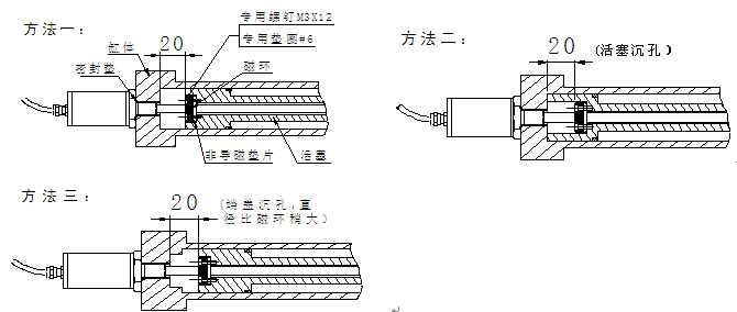磁尺内置液压缸使用时,其稳定性和精确度直接受到周边磁场环境的影响。若液压缸为导磁材料制造,必须参考图一方法设计,保证磁环与液压缸端面之间保留20mm距离。